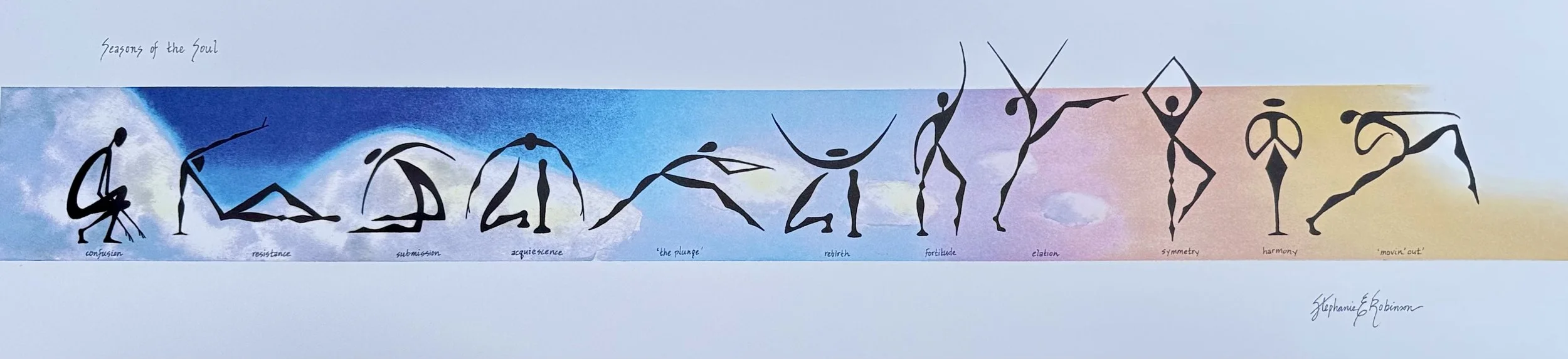 Seasons of the Soul Is a pictographic story of transformation and becoming. It reflected my own inner struggles with self-acceptance and identity during the time it was created. Over time I began to realize the artwork revealed natural cycles in my life. Other people identified with it in regards to their own lives. I began creating original watercolor and ink paintings with the figures in a horizontal line. In some of them, I started adding subtitles under the figures. Some people requested the artwork to be made without the subtitles as they preferred to interpret their own meaning for each figure. Others preferred the subtitles. Over time some of the subtitles have been changed but the figures remain true to how they originally came to being.